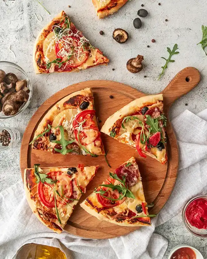 Meidät tunnetaan herkullisista kiviuunipizzoistamme, jotka leivomme aina käsin tilauksesta. Taikinan pitkä kohotus ja omalla reseptillä valmistus takaavat täydellisen pohjan. Paistamme pizzat aidossa kiviuunissa, mikä antaa niille oman aidon italialaistyylisen makunsa ja rapean pohjan